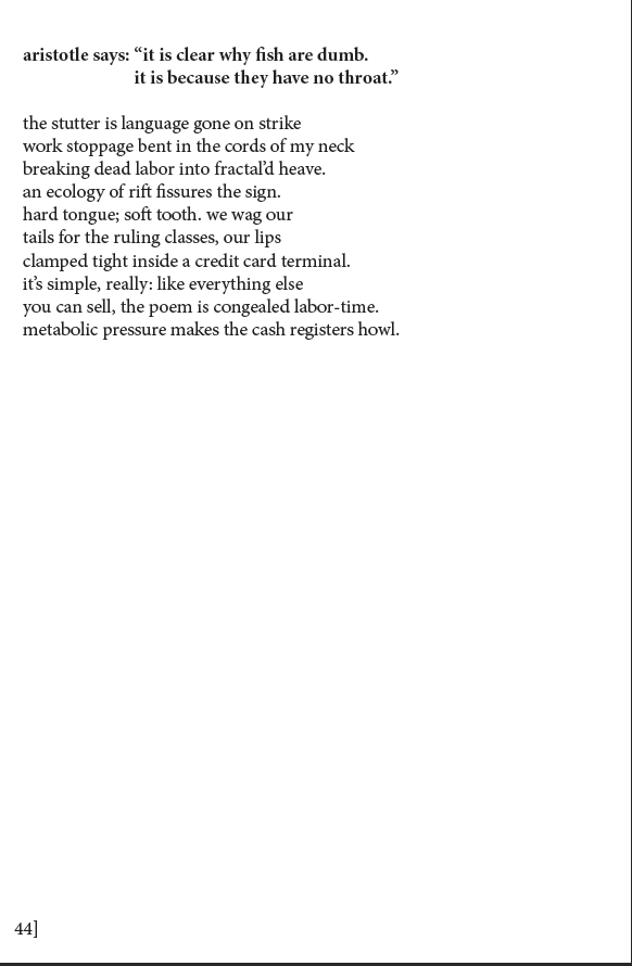 “Mathilda Cullen and Dominick Knowles ask questions that can only be answered with revolt "What poetics evades the police without policing evasion?" we read in something like a statement of artistic intent: "is there a violence that can let the poem kiss its riot without acting its riot shield?" Reminding us that stanzas are the living rooms of empire, that lines are the lounge chairs of mass death, and that that no recognized rhythm or meter will ever grip the falling rate of profit, these poems refuse to offer any sort of transcendental vantage point They also reject the stale idealism of institutionalized non-thought, wherein imagination is so frequently misidentified as the principal site of political resistance. Instead, these are poems for those for those of who must work to live and who cannot make rent, taking shape as a lyric survey of cracks in the edifice of capital and of possible grounds for communal flourishing. Their resolutely collective pronouns oppose the depredations of the value-form with a world in which everyone, everywhere, has their share of everything. Carry these poems into the streets. Wrap them around a brick and hurl it through a window. Douse them in petrol and torch the nearest precinct."